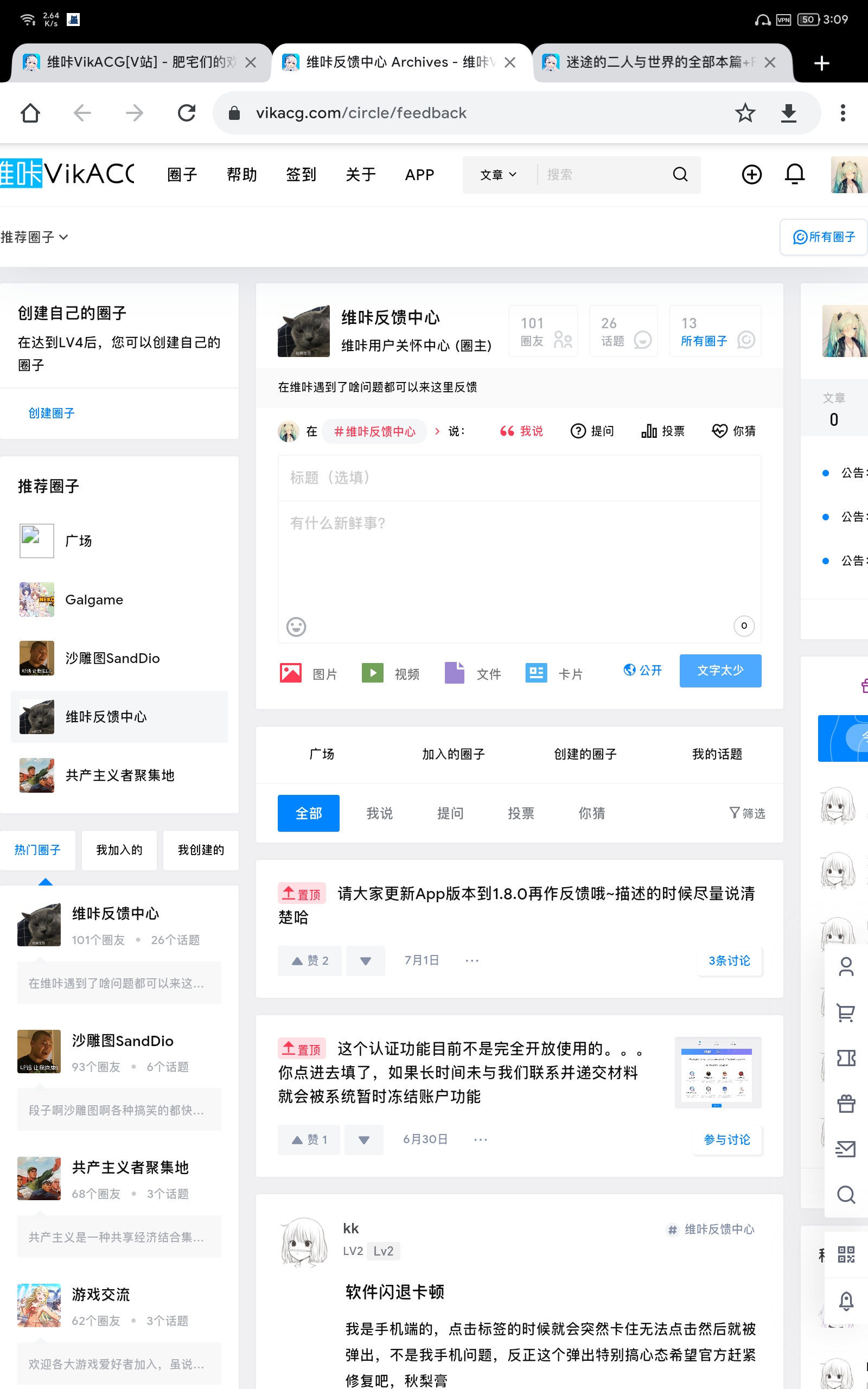 屏幕大小是2560*1600的,横屏使用没有问题,竖屏用着好别扭。主页文章标题看俩字没了,标题前面的分区竖着写都写出框框显示不全了。并且广告如果加载错误的话会把顶栏给挡着。如果在圈子里排版没有问题,但屏幕右边本应该有的个人信息,签到榜直接被切割看不到了,并且画面无法缩放