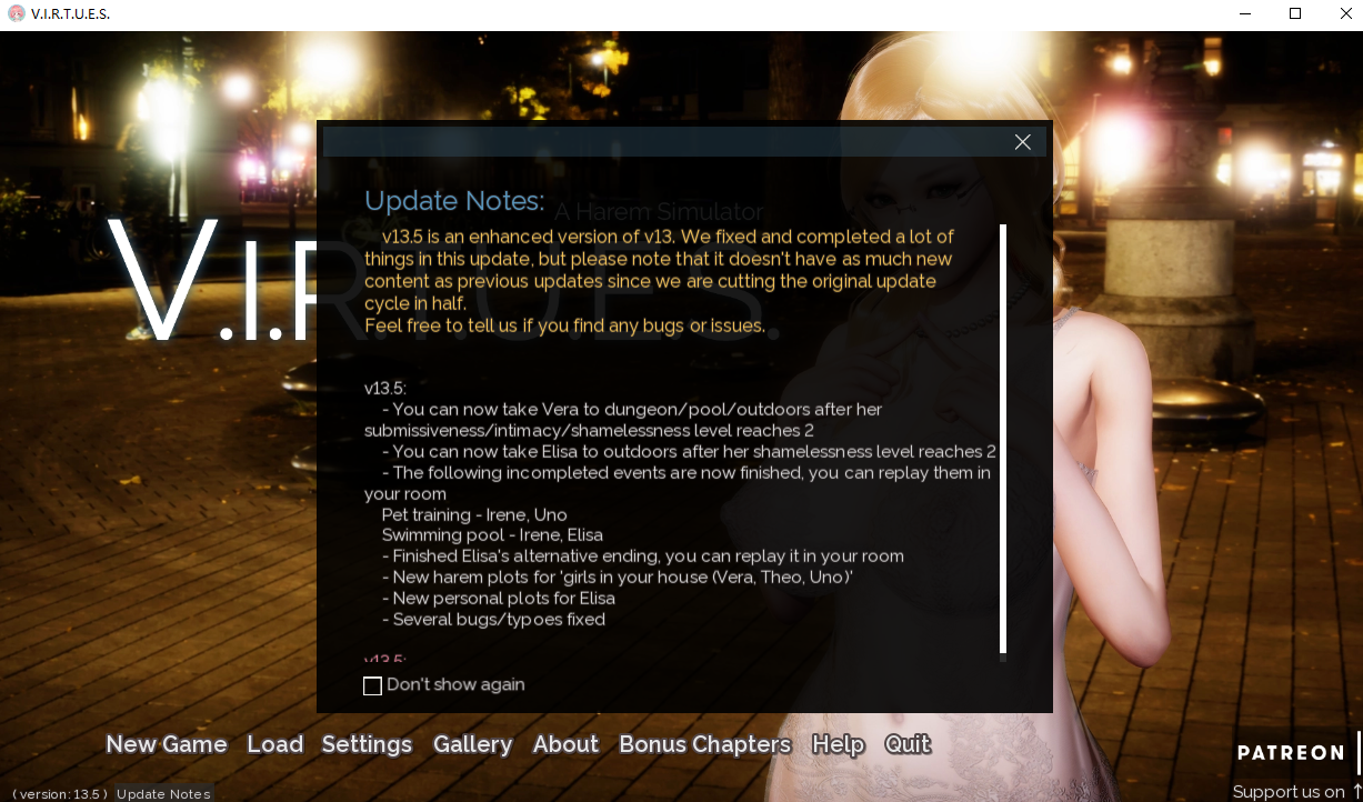 V13.5 请注意,由于我们将原始更新周期缩短了一半,因此 v13.5 的新内容不会像以前的更新那样多。 现在让我们来看看更新中的新内容: - 带女孩去 你现在可以在薇拉的顺从/亲密/无耻等级达到 2 后带她去地牢/游泳池/户外 无耻等级达到 2 后,您现在可以将 Elisa 带到户外 - 未完成的事件现已完成: 你可以在你的房间里重播 宠物训练 - Irene, Uno 游泳池 - Irene, Elisa - Elisa 的另类结局 你可以在你的房间里更换它 以及新剧情!图片预览【懒得截图了蹭别人的awa】