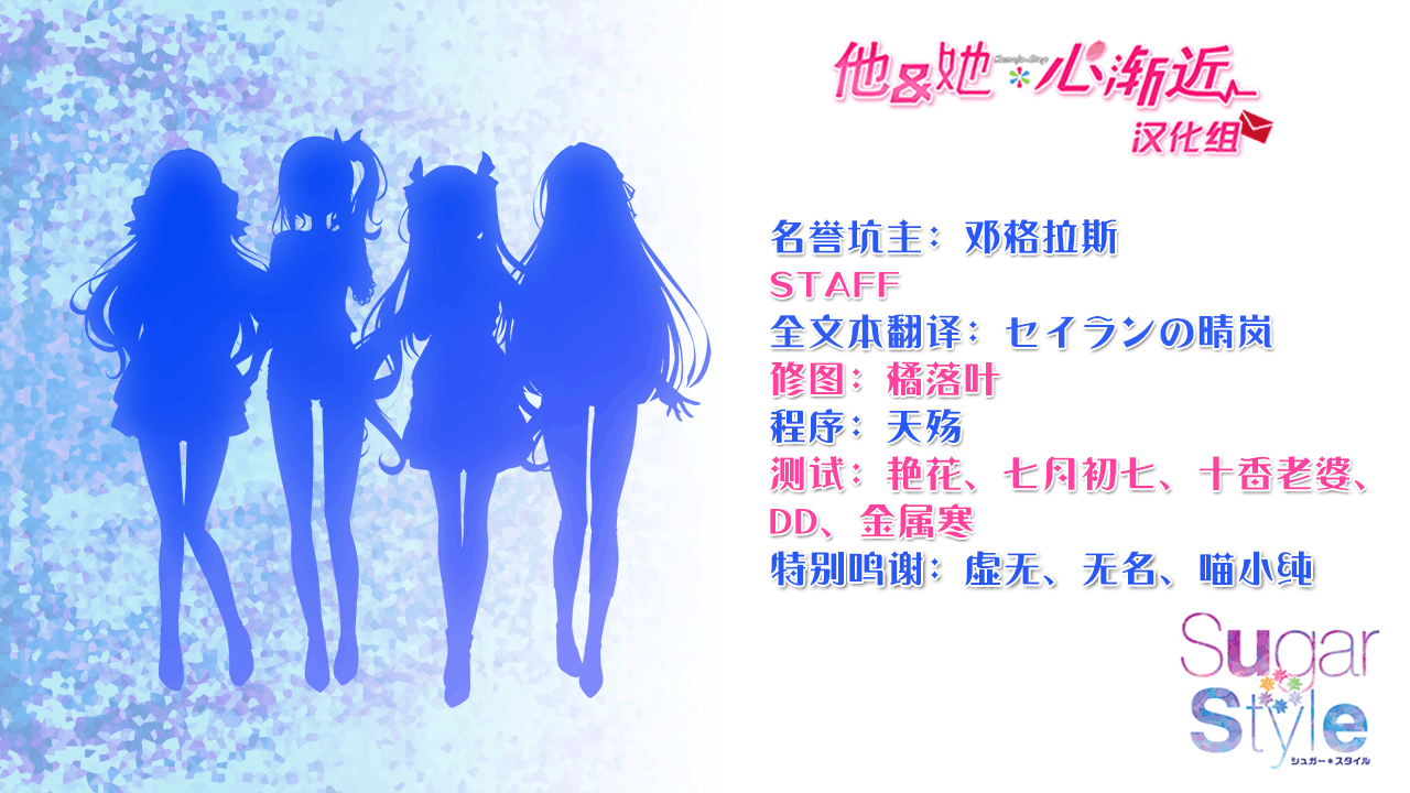 ※汉化补丁方面,补丁以他&她*心渐近汉化组的名义制作发布,补丁稍后会在隔壁的SMEE吧和他与她心渐近吧发布。Bugbug的初枫番外剧情并未收录在内。问题反馈可以去他与她心渐近吧的反馈贴反馈,当然也可以去SMEE吧官方群里反馈,我会持续跟进。