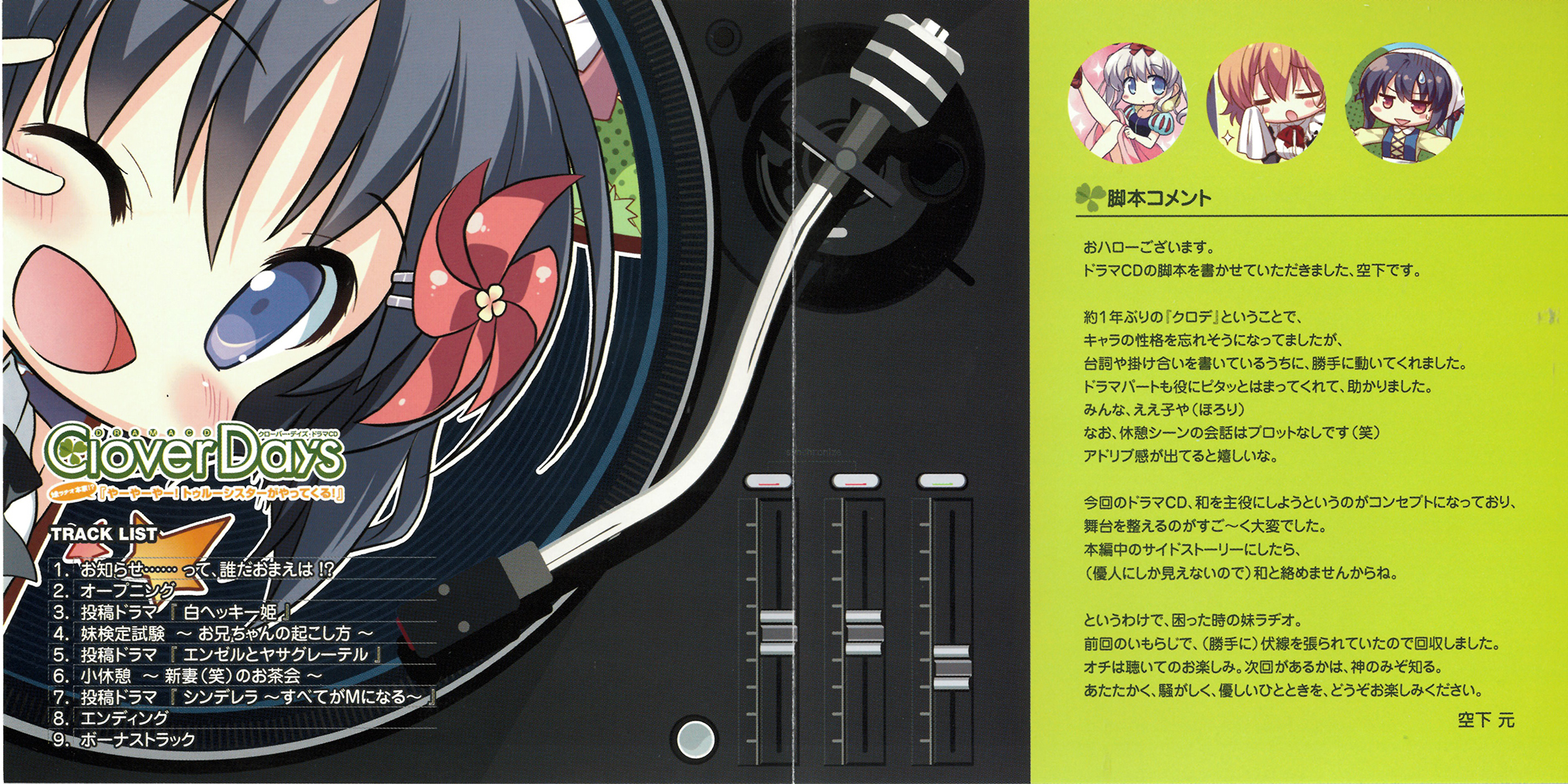| タイトル | 【妹ラヂオ本家 やーやーやートゥルーシスターがやってくる】 ①・お知らせ……って、誰だおまえは!? ②・オープニング ③・投稿ドラマ『白ヘッキー姫』 ④・妹検定試験~お兄ちゃんの起こし方~ ⑤・投稿ドラマ『エンゼルとヤサグレーテル』 ⑥・小休憩~新妻(笑)のお茶会~ ⑦・投稿ドラマ『シンデレラ~全てがMになる~』 ⑧・エンディング ⑨・Clover Heart's -New days recording- game ver. | ||