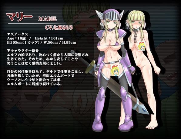 人类和精灵共同生活的国家——卡马维特尔—— 它曾经是一个只有精灵居住的国家。但是人类在那里登陆,捕捉了大量无辜的精灵。 (精灵在什么世界观果然都是战五渣……) 人类把这块土地命名为卡马维特尔,把幸存的精灵们当作奴隶,养殖起来。 100年后的今天,对“精灵”的歧视仍根深蒂固。 (你会和你家狗狗平起平坐吗?) 因为精灵是禁忌的存在,所以不能给予她们人类的权利。 精灵对人类来说只是发泄浴网的东西,所以不能穿任何衣`服。 精灵活着就是原罪!要时刻的惩罚!时刻的鞭笞! 当然,作为一名前凸后翘颜值诱人的精灵少女玛丽也不能逃过命运的惩罚 从出生起,她就饱受、鞭打、歧视,艰难成长。 命苦的玛丽在大约一年前到达埃尔姆港, 在那里遇见了心地善良的少年乌诺。 乌诺患有原因不明的疾病,医生断言他的生命只剩几天。 玛丽不喜欢人类,但她想拯救乌诺 甚至期望可以留在这个美丽的港口和乌诺生活 有一天,玛丽像往常一样结束了在基多的工作,回到城里, 乌诺的父亲正在和神秘组织的老板说话。 如果有四个散布在世界各地的神器,乌诺的病似乎就能治好。 玛丽为了治好乌诺的病,决心再次踏上旅途。 (好吧,更正一下,决心去各地当RBQ)