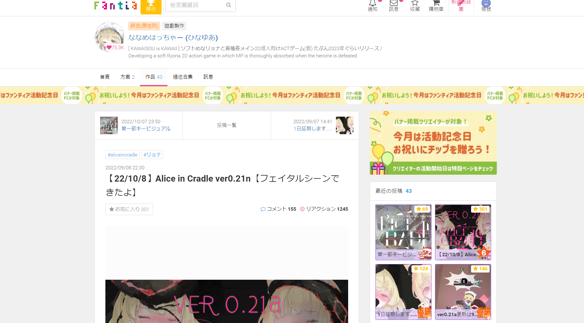 目前遊戲處於開發階段,支援連結:ななめはっちゃー (ひなゆあ)|ファンティア[Fantia]