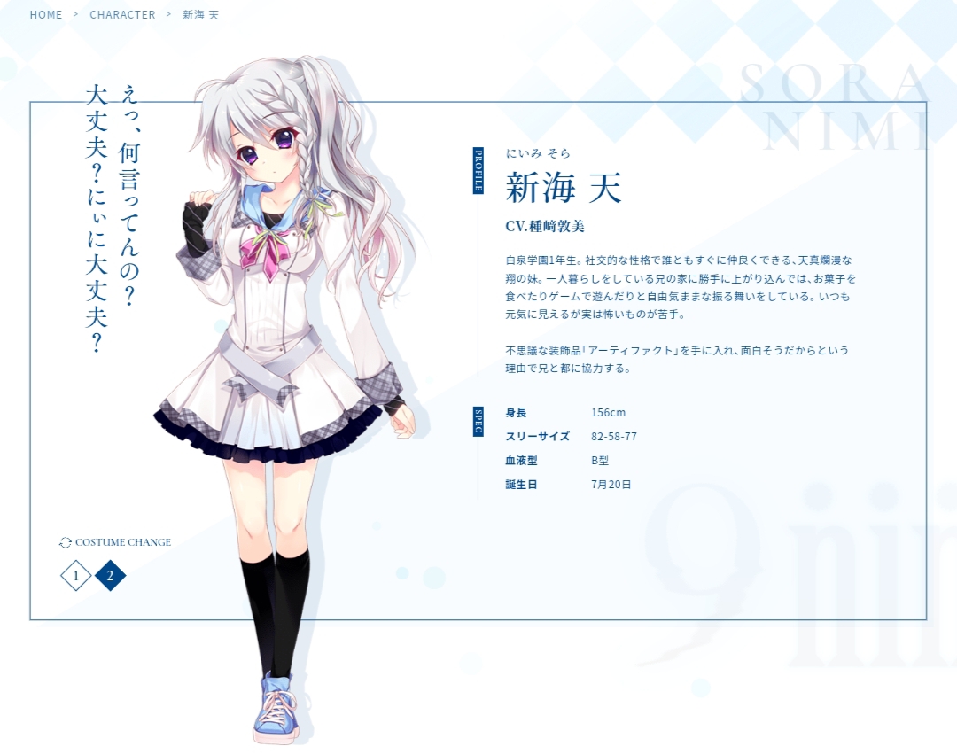 新海天:Vol.2的女主角,翔的親妹妹,白泉學園一年級生,性格天真活潑,跟任何人都能馬上打成一片,和翔的感情很好。