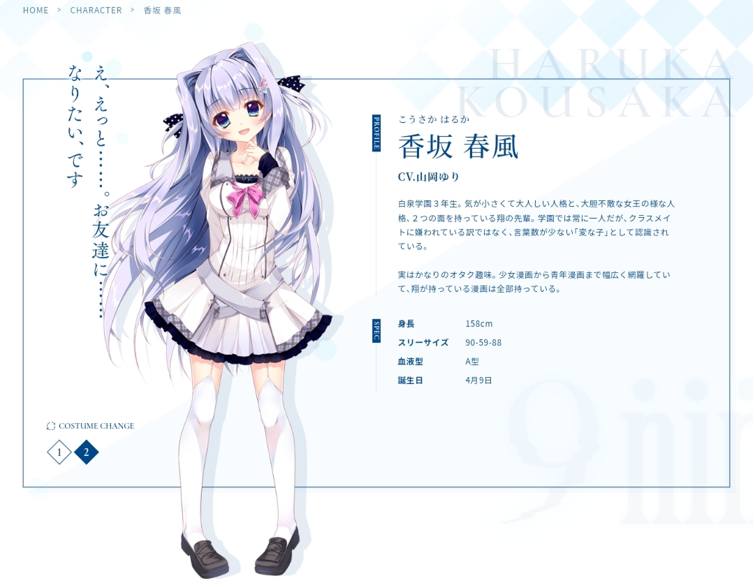 結城希亞:Vol.4的女主角,玖方女學院二年級生。喜歡吃「Nine Ball」的聖代,被翔暗中稱為「聖代女王」。正義感強烈性格十分中二,非常喜歡貓。因為興趣和喜好和春風非常類似因此在一些路線時兩人的關係很良好。