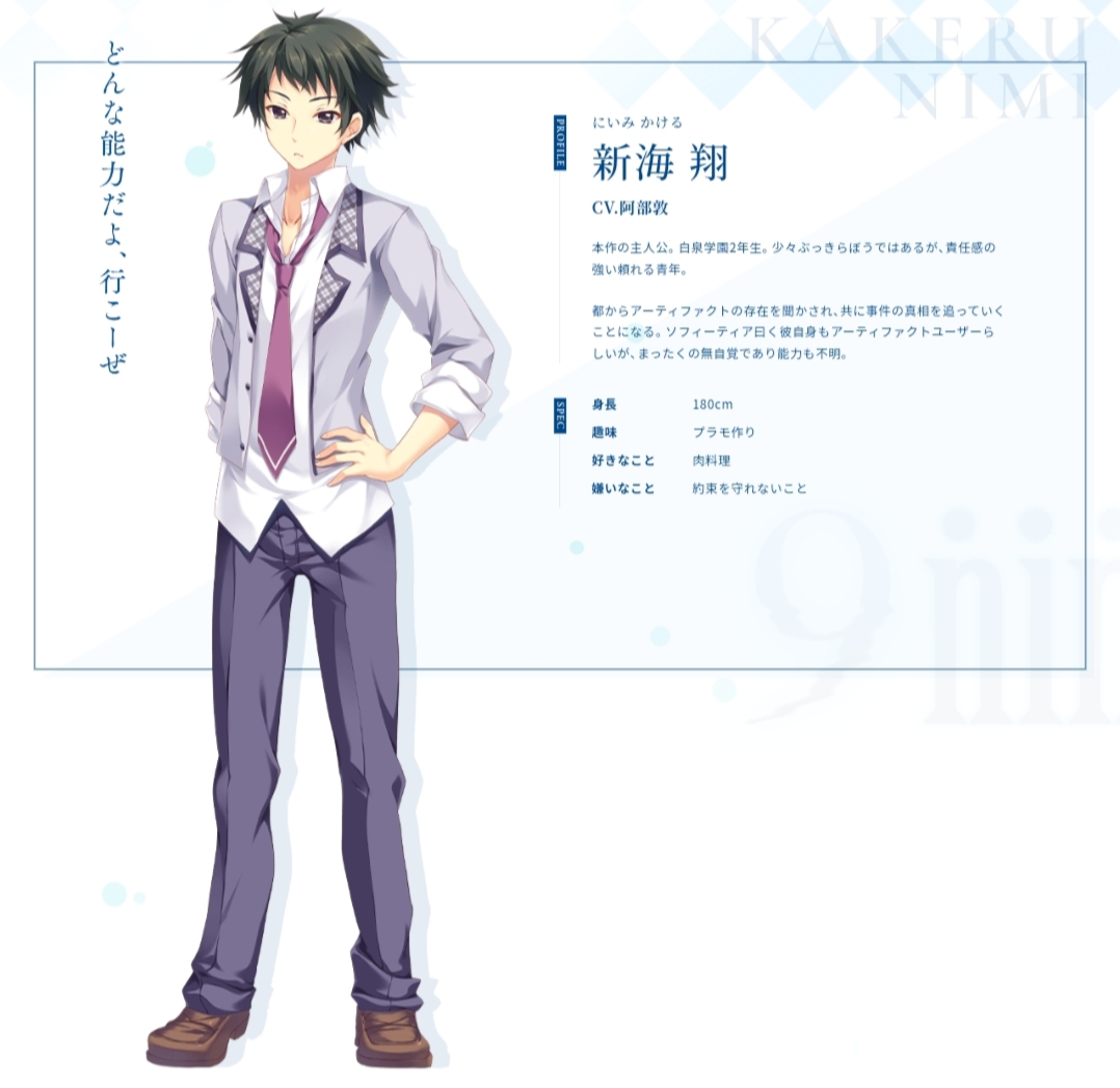 新海翔:作品男主角,白泉學園二年級生。責任感強且思緒敏捷。不擅長團體行動所以很少朋友。因為妹妹天想要自己的房間,在進入白泉學園就讀時便在學校附近的公寓獨居。發生Artifact事件後,被蘇菲堤雅要求回收所有Artifact。