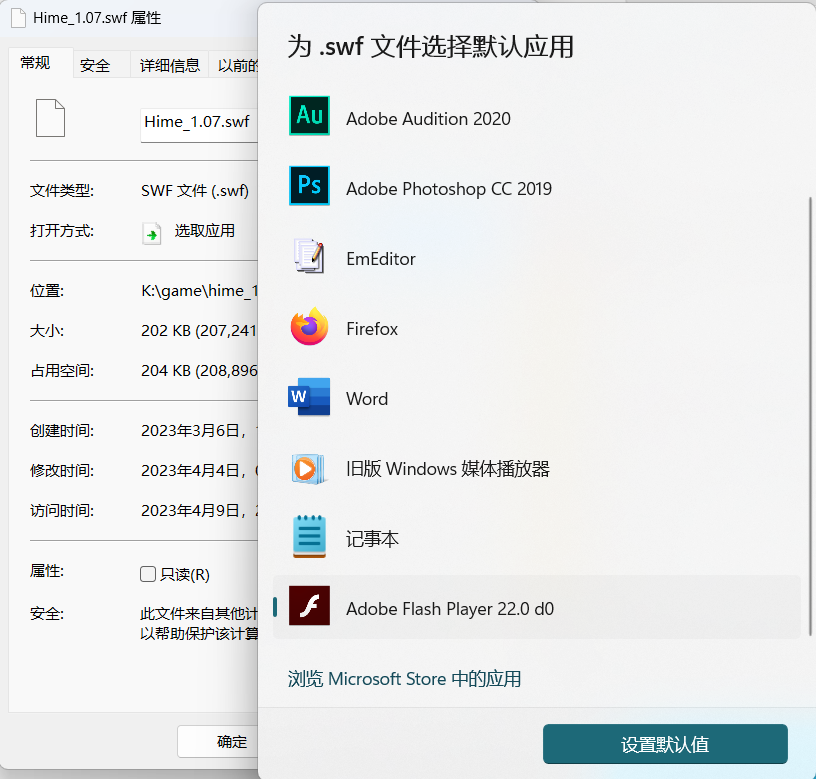 本方法适用于不想下载安装flash中心的朋友。 这个更新通知似乎只针对较新版本的flash启动器(flash32),所以换回老版本启动器就能解决问题。 这里推荐flash22,很容易能下载到。 具体方法,以犬公主为例,把"swf"文件的启动方式改为flash22,然后直接启动"swf"文件就可以了。