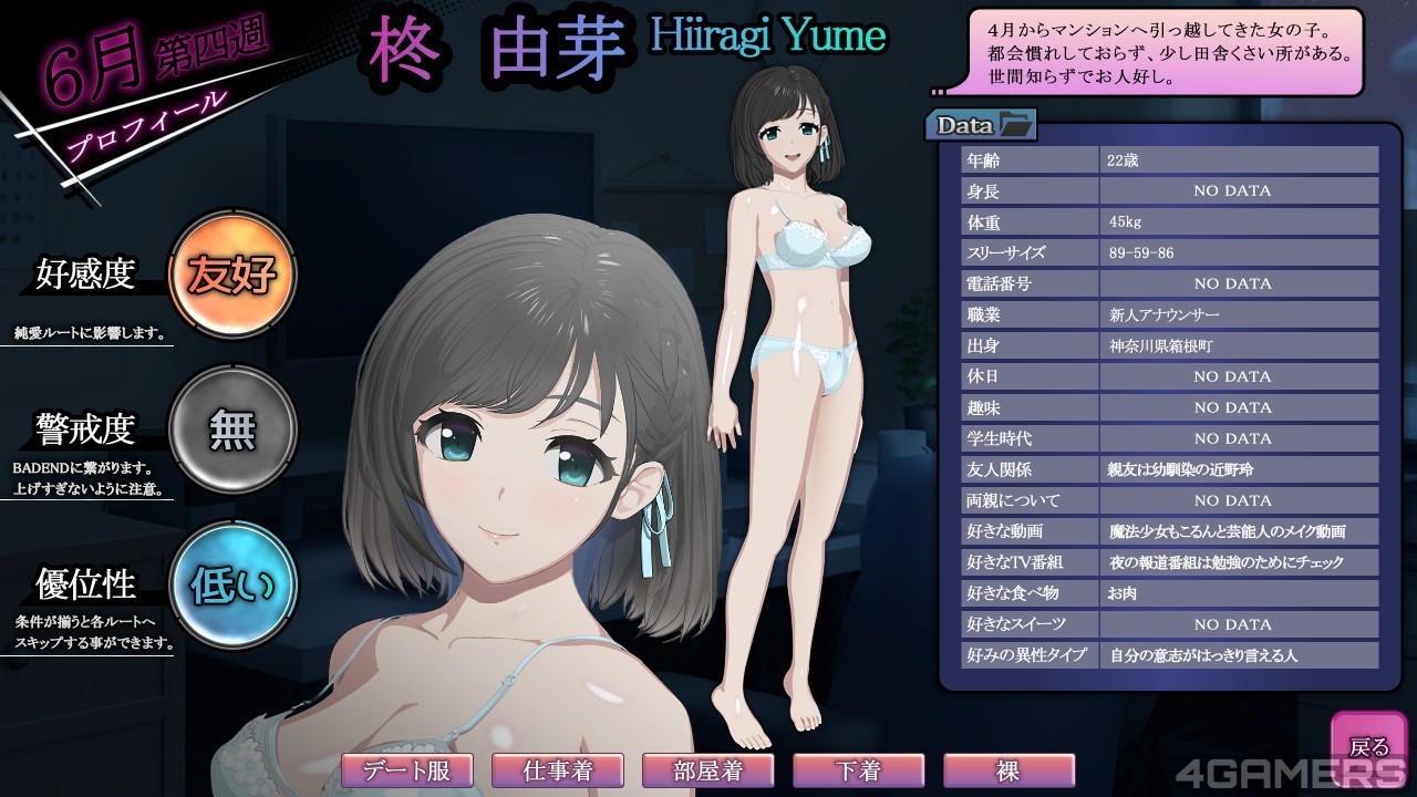 「柊由芽」不但外表可愛,身材姣好,還外帶第一次從鄉下來到大都會,不知人性險惡,主角簡直是抽到了 SSR,對女主角一見鍾情的主角,自然將目標就轉移到很傻很天真的女主角身上了。遊戲採用類似回合制的設計,玩家可以在一周開始時安排五次行動,再依照行動結果對女主角造成影響。