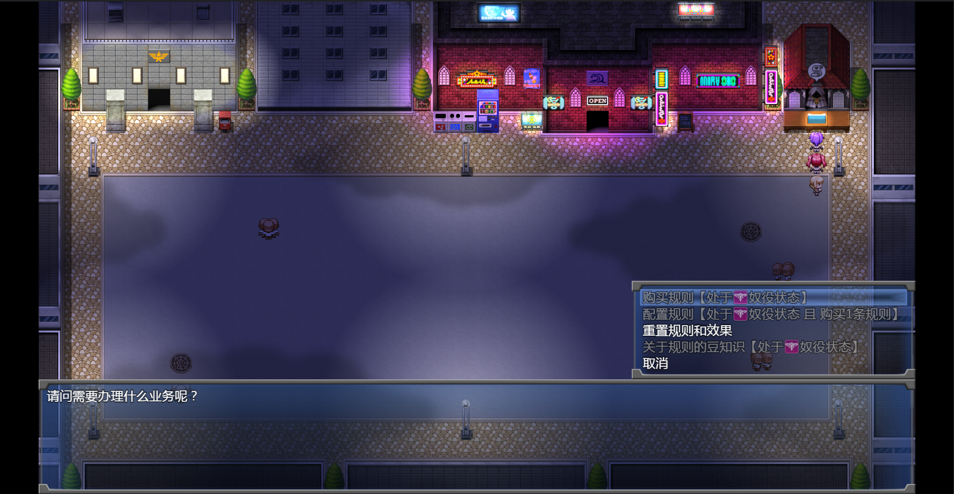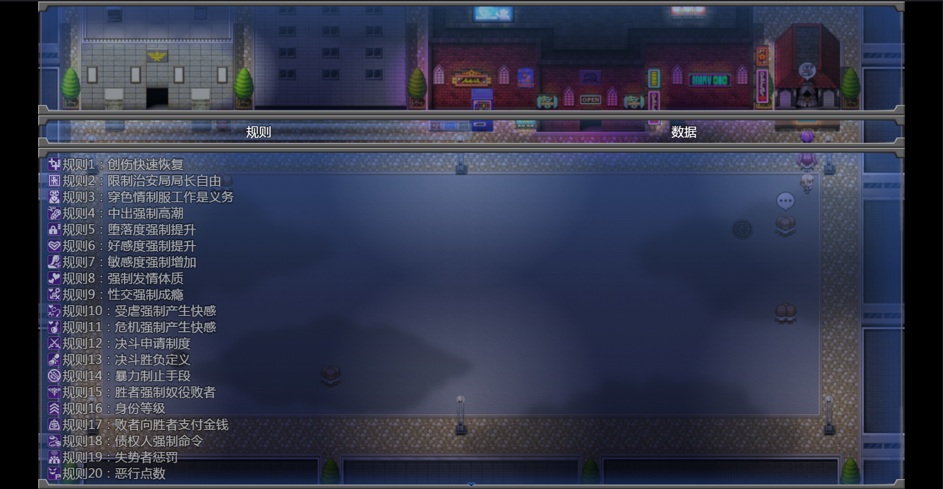因此,如果想刷淫乱、高快感等级的请在游戏开始之后立马败北获得奴隶状态,然后立马去神秘人那里重置所有规则,这个操作就满足了下面一条“解除过一次奴役状态”,这样以后就可以只解除奴役状态这一规则了