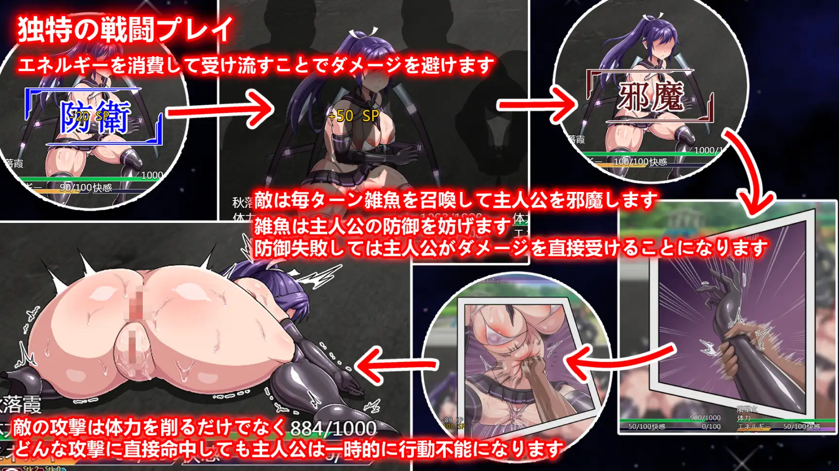 本作的特点是工口CG没有使用视觉小说式的呈现方式,而是会在战斗场景中直接进行呈现。玩家不再需要无聊地等待战斗结束后再欣赏战败CG,而是可以直接在战斗场景中快速体验这些内容