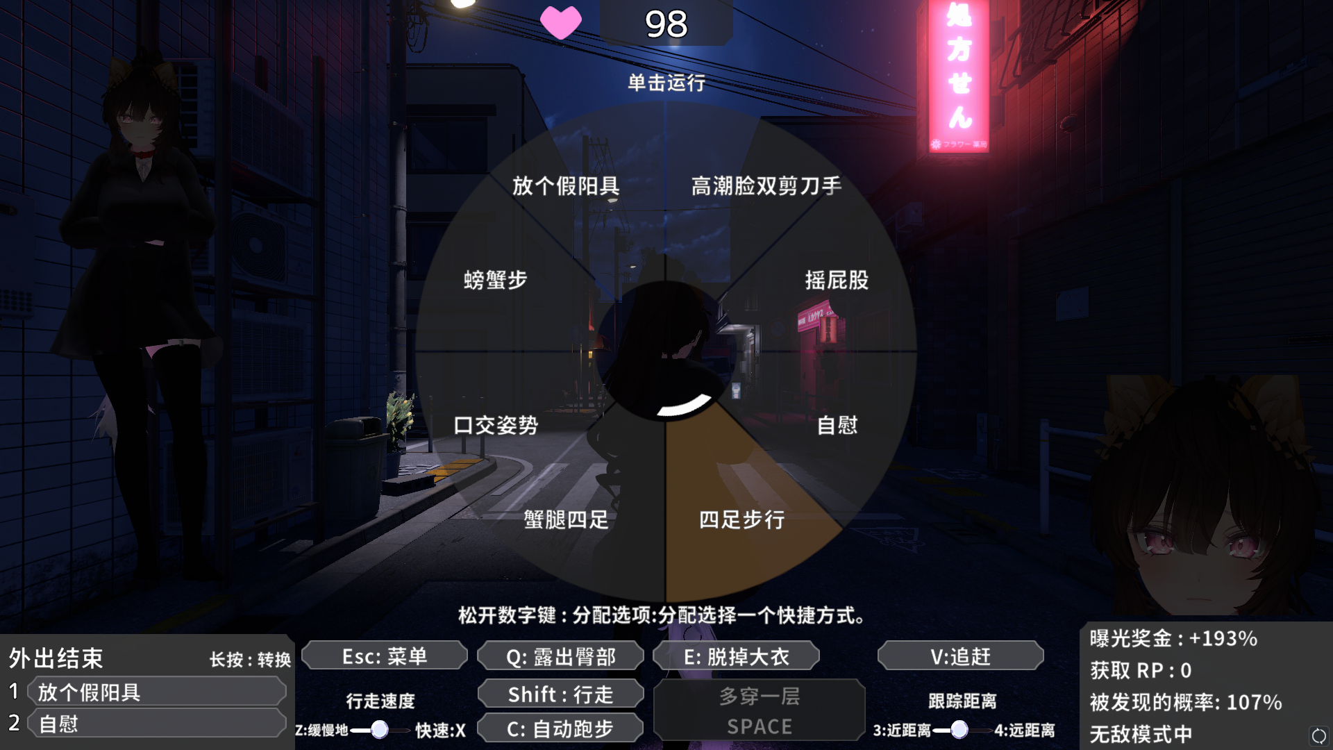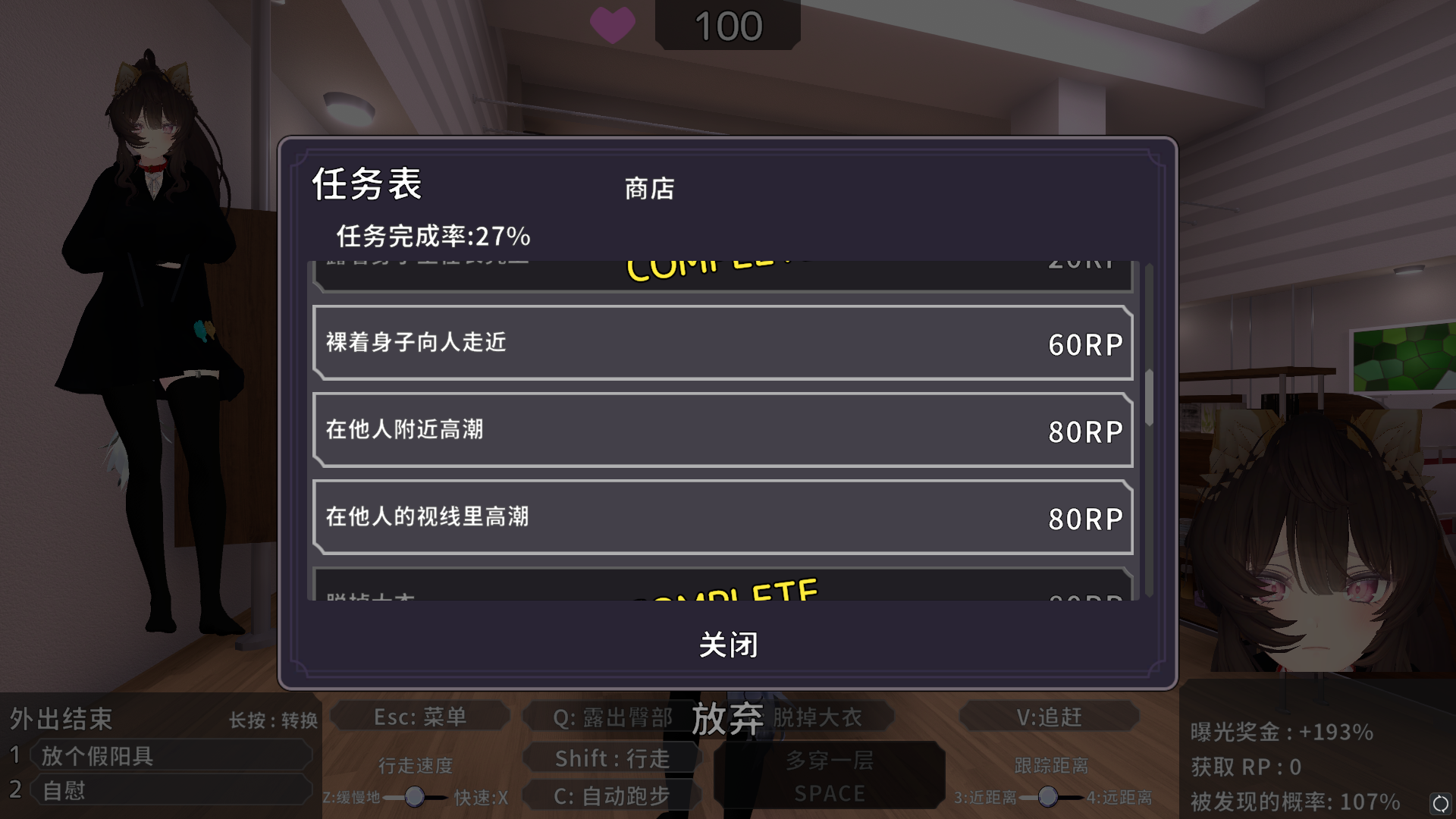 游戏总共三张地图,不同地图会有不同的露出任务和不同的互动场所,完成任务能获取大量点数