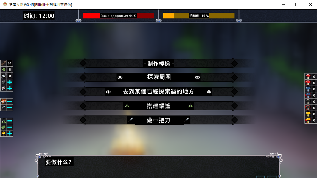 前期先采蓝黄蘑菇。蓝蘑菇可以直接吃。也可以熟了吃。但黄蘑菇必须得煮熟吃。其他蘑菇都是有毒的。黄蘑菇熟了没毒反而解毒。 接下就是注意饱食度和血量,一边采集树叶木头做帐篷做火堆把舒适度搞上去生存方面就没问题了 剩下就是去杀蜘蛛,杀蜘蛛必中毒和扣血。吃点熟黄蘑菇和蓝蘑菇就好了。拿的足够的蜘蛛丝和树叶木头就可以做梯子爬上去了 生火要7個樹枝(升完才能烤蘑菇,一天後會滅) 搭帳篷要60樹枝和10樹葉 做床要15樹枝和20樹葉 做梯子要20樹枝和10樹葉以及3蜘蛛絲+火+帳篷 做刀花時間和體力~ 23:00會自己跑去睡覺(還沒搭完帳篷別給我跑去睡阿餵!) 藍蘑菇建議別烤,很花時間,烤著烤著人就昏倒了=w= 睡完覺會扣40血40飽食,飽食不夠會扣血(好歹是獵人,睡個覺人就要沒了是什麼鬼阿!) 藍蘑菇回10血量15飽食度 熟藍蘑菇回20血量15飽食度 熟黃蘑菇回10飽食度+降20中毒小攻略