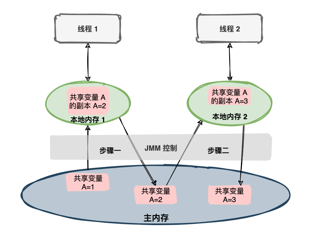 如果两个线程都对一个共享变量进行操作,共享变量初始值为 1,每个线程都变量进行加 1,预期共享变量的值为 3。在 JMM 规范下会有一系列的操作。
