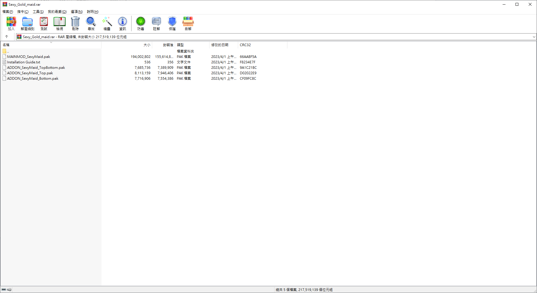 A:將壓縮檔打開,確認裏頭是否有多個壓縮檔或為各別.pak結尾檔案