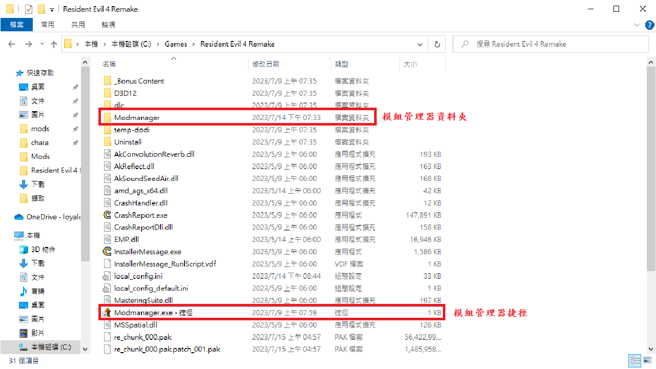 1.將模組壓縮檔直接放到Modmanager\Games\RE4R\Mods底下。