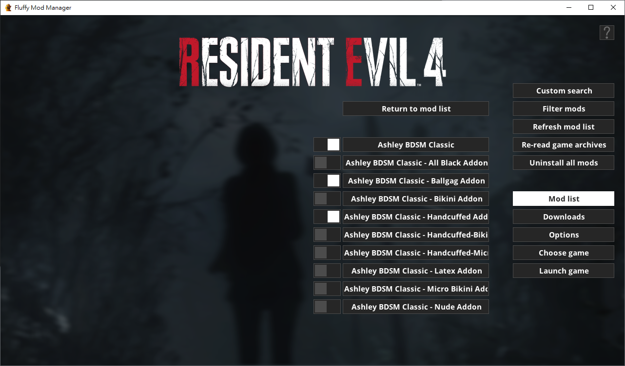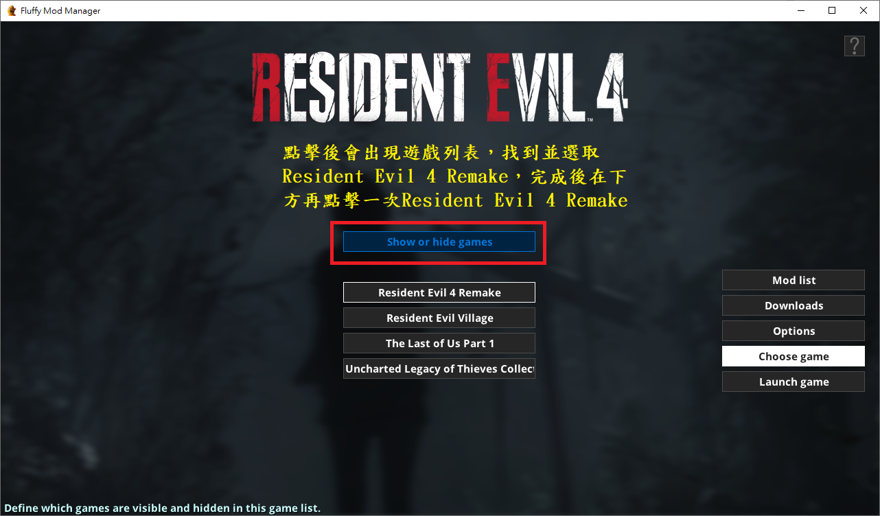 下載Fluffy Mod Manager(模組管理器)放到任一位置,並根據上方教學選擇主程式資料夾(會自動在管理器的資料夾創建Games/RE3R),而後將下載的Mods解壓並放入RE3R,並回到管理器刷新列表一次查看模組有無讀取成功。