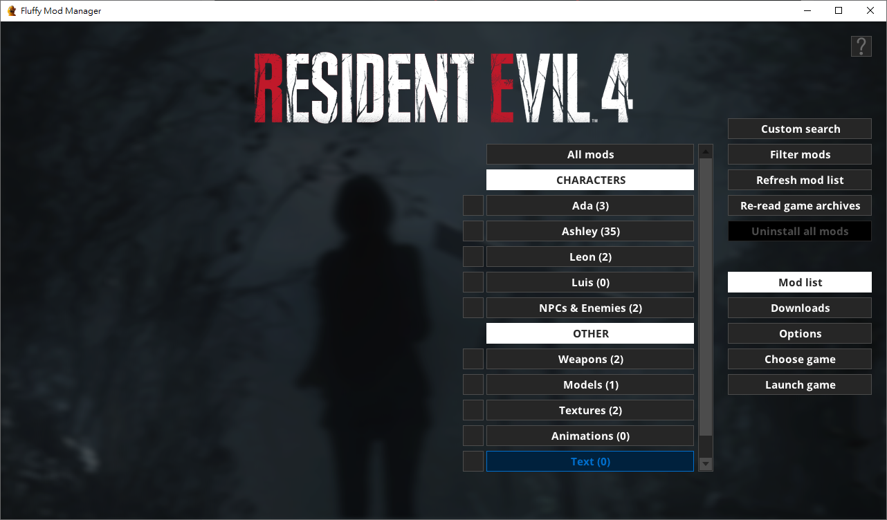 最常用到的就是Refresh mod list(刷新模組列表)及Mod list(模組列表),前者會重新讀取一次模組,後者則是顯示所有各角色、武器、場景的模組(細項陳列)。