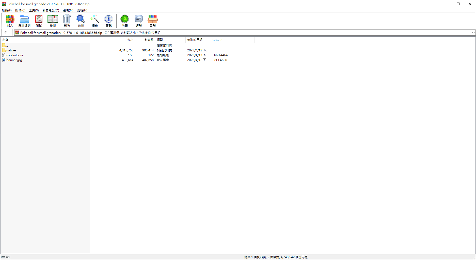 只有以下這種格式的壓縮檔可以直接丟入,多個資料夾也可以(建議先打開檢查內容物),壓縮檔則是要手動移出來。