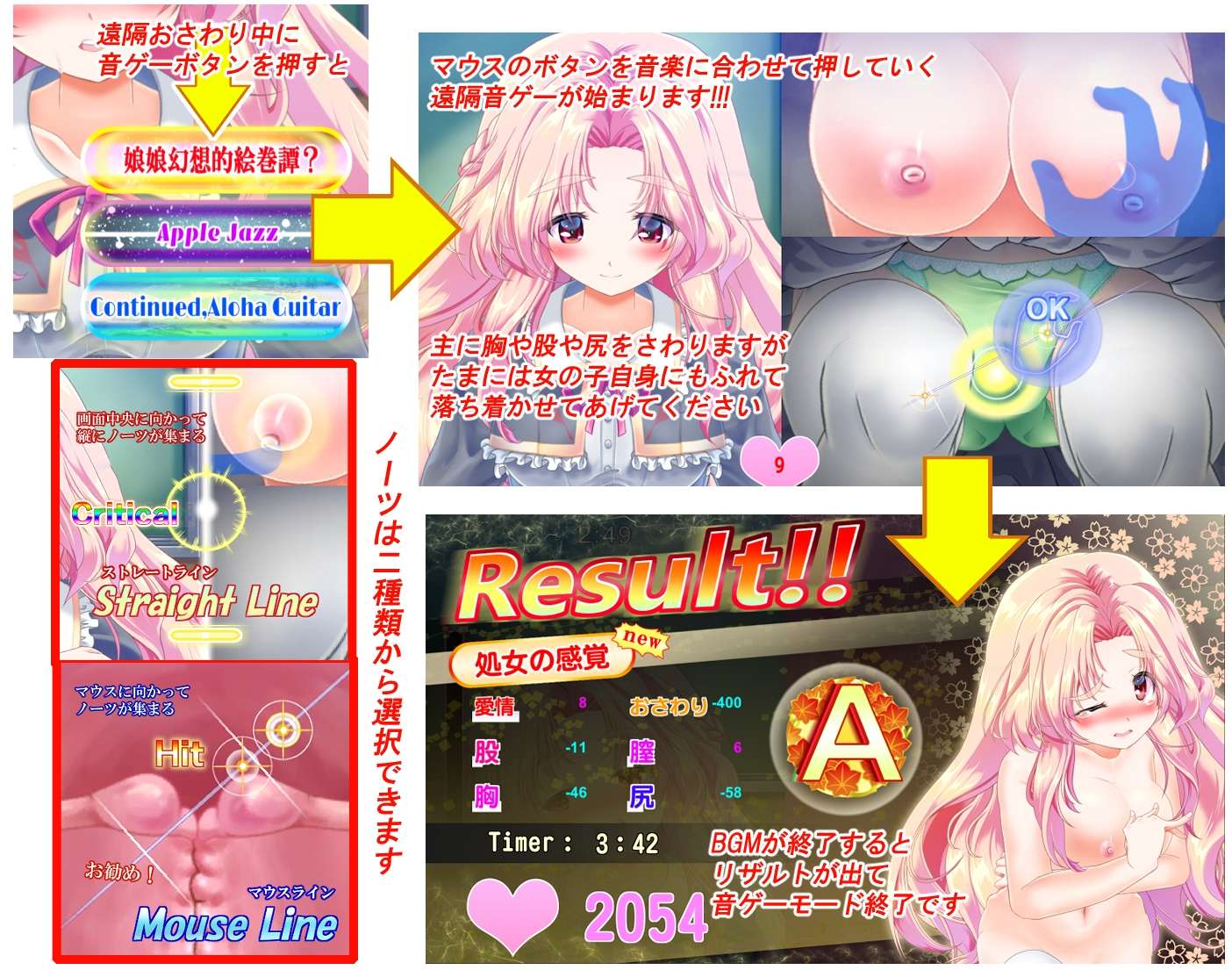 凭借情欲的力量,你可以通过远程触摸和音乐游戏触摸来积累快感,然后在故事模式中直接接触……等待着这些女孩的只有光明的未来!