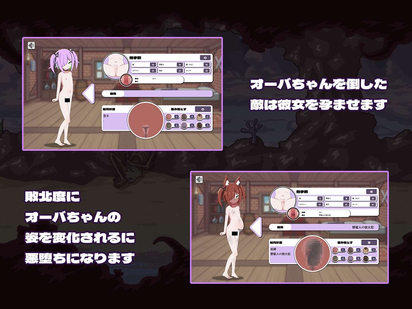 [オーバジーンはパーティーメンバーが必要ない] 是一款简单的地下城探索游戏。玩家操控オーバちゃん,征服地下城。每次胜利都会获得荣誉,而每次失败则会让オーバちゃん受到屈辱,导致心灵和身体受到影响,逐渐发生变化。