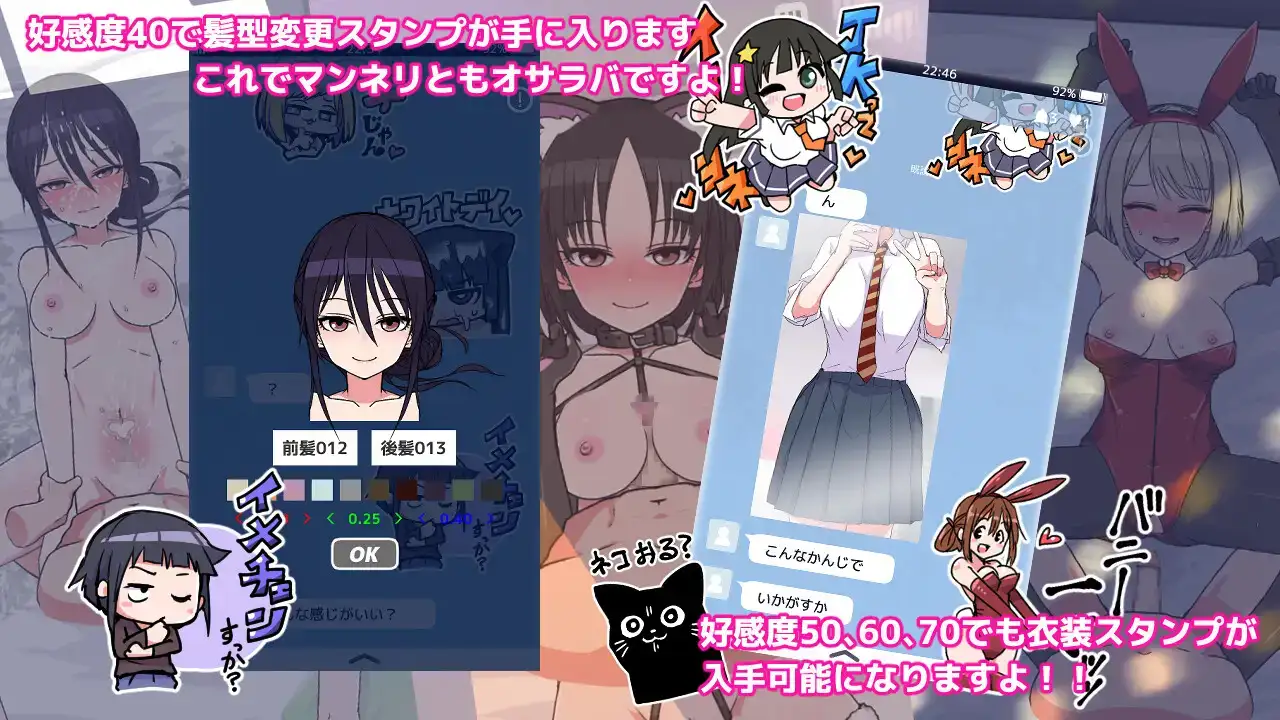这款游戏中,你可以邀请你的炮友米娜米小姐到不同区域并与她做爱做的事情;) 邀请她时,在手机屏幕上可以发送带有独特含义的表情包从而提出要求。 不断约炮会提高米娜米小姐对你的好感度,并允许你对她提出新的要求~~~ config界面有一个全解锁的按钮,如果你赶时间的话也可以用它。游戏截图
