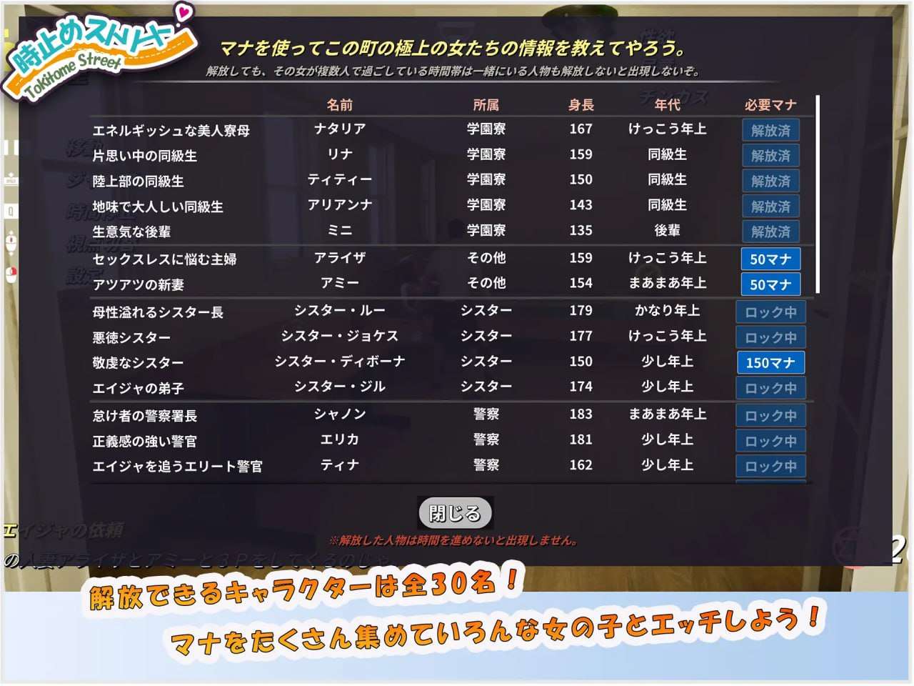 本作是一款可以在自由移动的开放世界中进行攻略和探索的3D游戏,同时还能与女孩们交流,并利用时间停止来做一些色色的事情