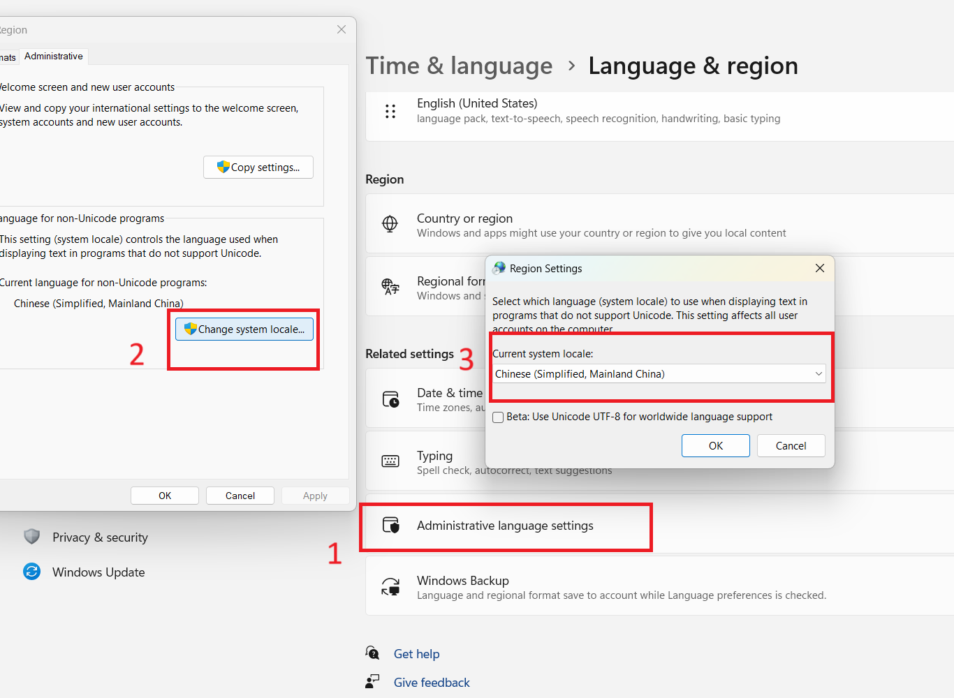 start菜单> setting> Time & language > Administrative language settings