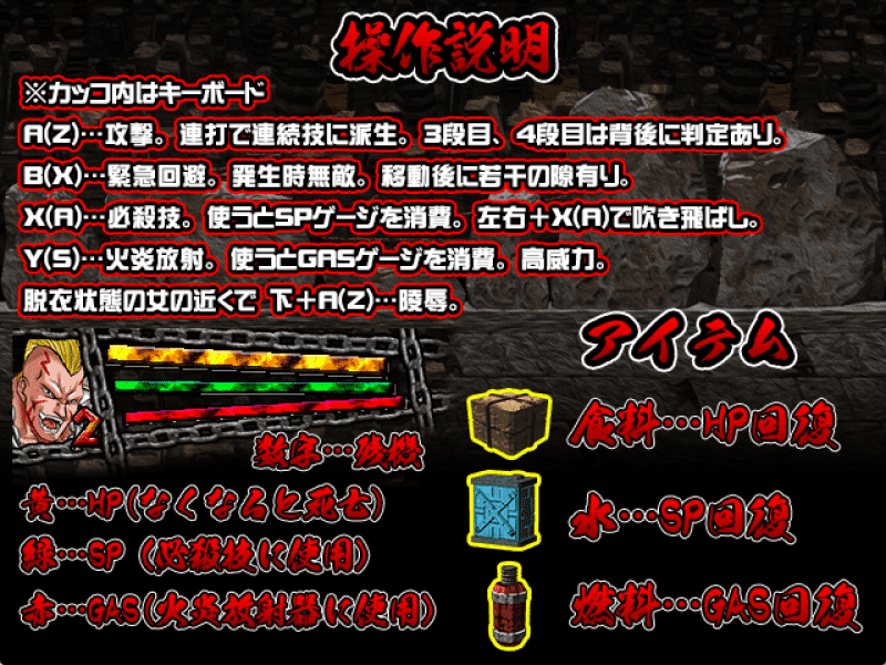 这是一款由鼎鼎大名的【StudioS】社团制作的ACT全动态游戏,总之这是发售于9.07号的新作ACT游戏!这次似乎觉得奴隶题材不够给力,直接将故事搬到了世界毁灭后的废墟中!而你……则是其中最卑鄙,最无耻,最残忍的……机车暴走族!!(好吧我承认了,这简直和北斗神拳一个德行……)将男人全都杀死!将女人全都折磨!释放你的兽欲吧!让这群幸存者知道!什么才是世纪末!!!!