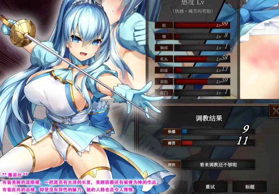 是一款对壁尻状态的女骑士进行凌r、调教、当作肉便器的触摸游戏。