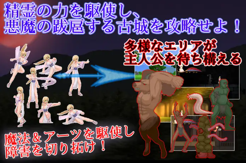 虽然是受到了来自于精灵的加护的主人公,但是在体力变为0的后也还是会摔倒,在这期间如果被敌人接触到的话便会进入【Sexaul Assault(SA)的】的工口演出,被敌人进行凌○。