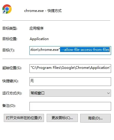 第一步: 在谷歌浏览器鼠标右键属性 目标exe”后粘贴英文 --allow-file-access-from-files (注意--allow前有空格)