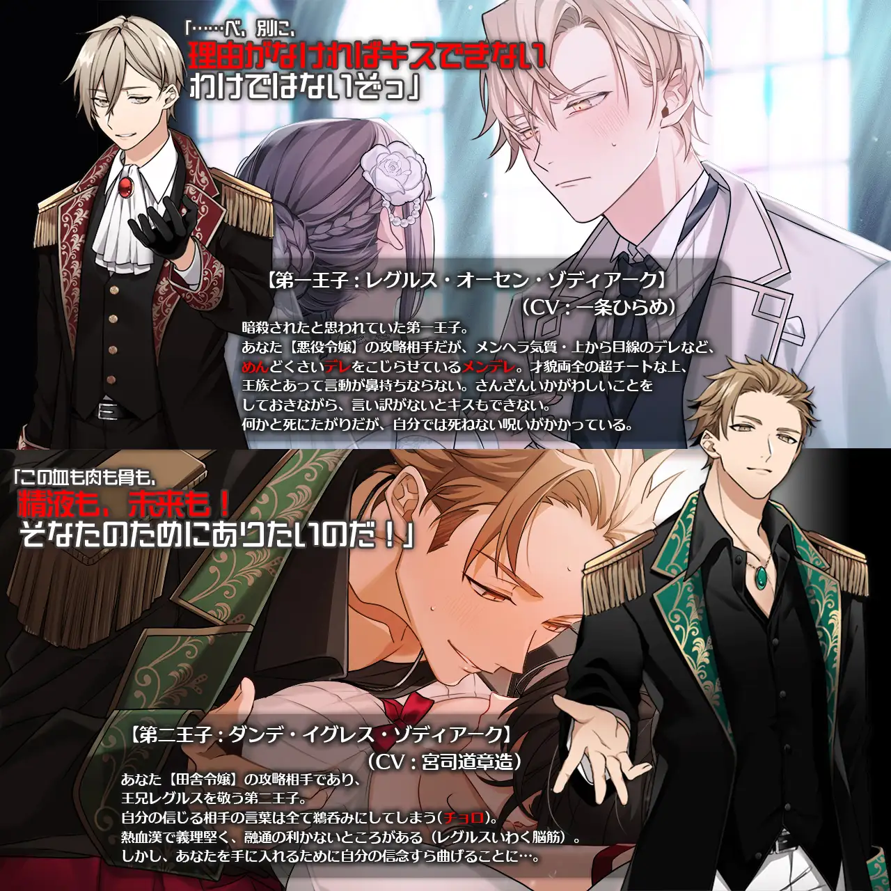 「レグルス」(聲優:一条ひらめ) 第一王子,原本被認為已經被暗殺。他是你的主要攻略角色,性格複雜多變,既自大又兼具依賴性,擁有極高的才華和美貌,但行為常令人難以忍受。他身上還背負著不能自我了結生命的詭異詛咒。