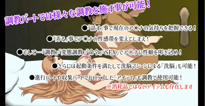 本作品是一款包含被他人夺走爱人视角的 “小说游戏”+“简易的 BOSS 战斗”+“调教游戏”+“类似以场景推进为概念的手机游戏的简易关卡推进游戏”+“用于寻找道具的简易道具收集循环游戏”。