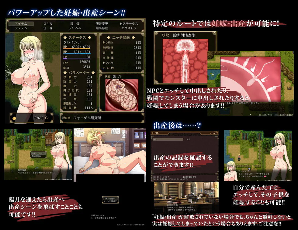 随着你推进特定路线的剧情,你将获得怀孕的能力。你可以 让各种各样的生物怀孕并出生,