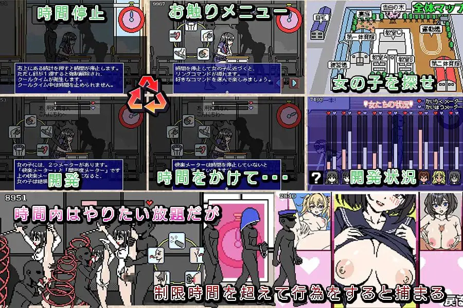 主角現在可以暫停時間。然而,暫停時間並不會改變壽命。此外,暫停的連續時間也有限制。在有限的條件下讓女孩子們高潮吧。