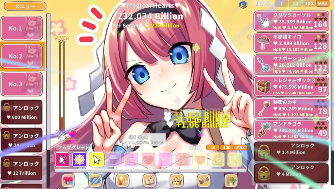 点击屏幕积累能量条,在附带生产力加成效果的“狂热模式”中获取大量爱心!