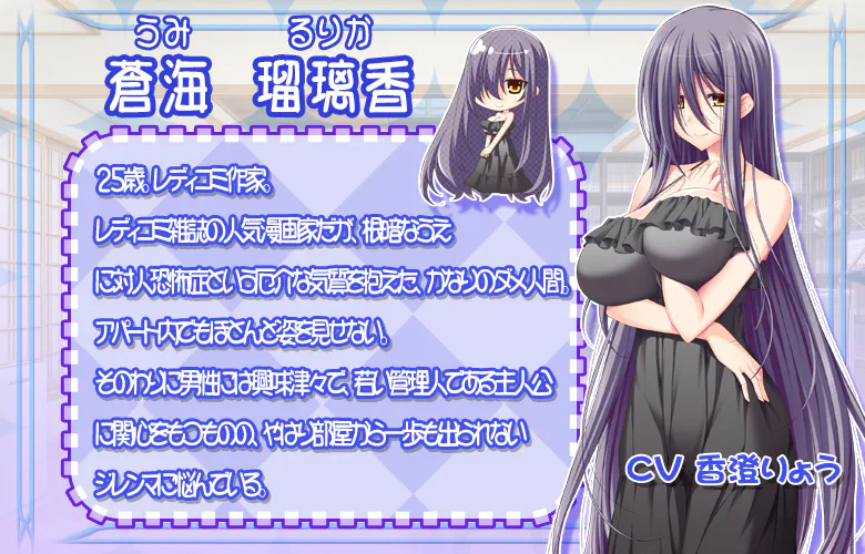 蒼海 瑠璃香 CV 香澄凉 25岁。女性向漫画作家。 虽是女性向漫画杂志的人气漫画家,却是个性格阴郁、患有人际交往障碍的麻烦人物,堪称废柴。 相反对男性充满好奇,虽对年轻的管理员主人公产生兴趣,却因无法踏出竹取小屋一步而陷入困境。 |