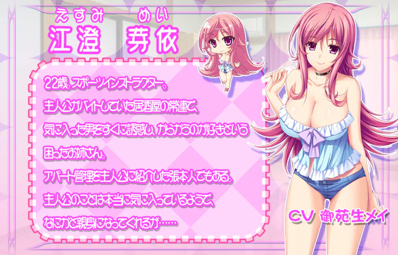 江澄 芽依 (えすみ めい) 22岁。运动教练。 |