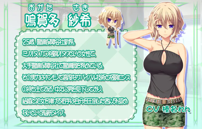 嗚賀多 紗希 (おがた さき) CV 榛名莲 身为美奥努斯族且是格斗宅的女性,在大型安保公司担任警卫员。其实力货真价实,精通高阶生存技能与格斗天赋。因此对男性极度轻视,坚持唯有能压倒自己的对象才配获得她的婚姻与贞操,是典型的肌肉脑筋型。 |