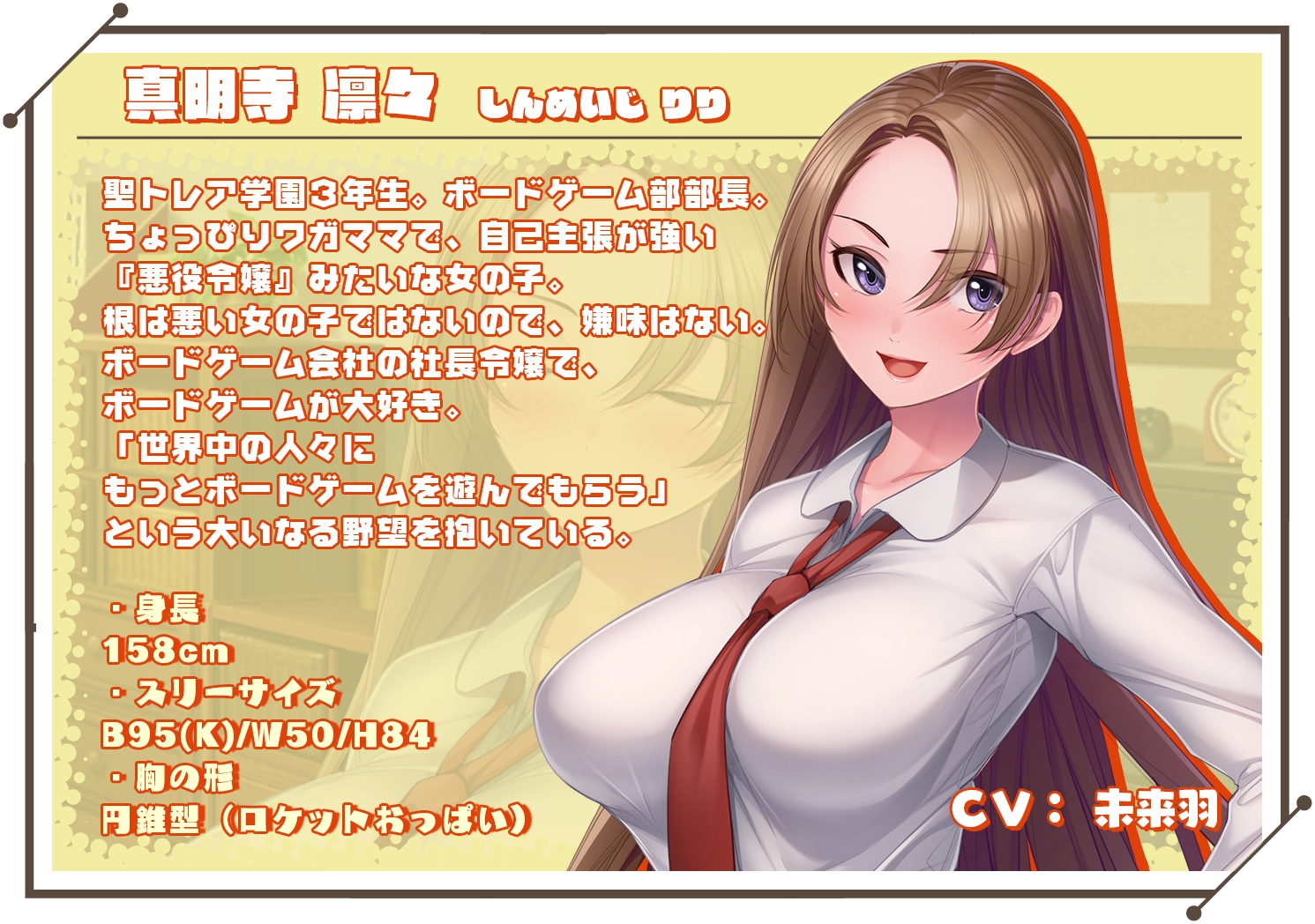 真明寺 凛々(CV:未来羽) 身高:158 聖トレア学園三年级,桌游部部长。 是桌游公司的社长的千金,很喜欢桌游。 |