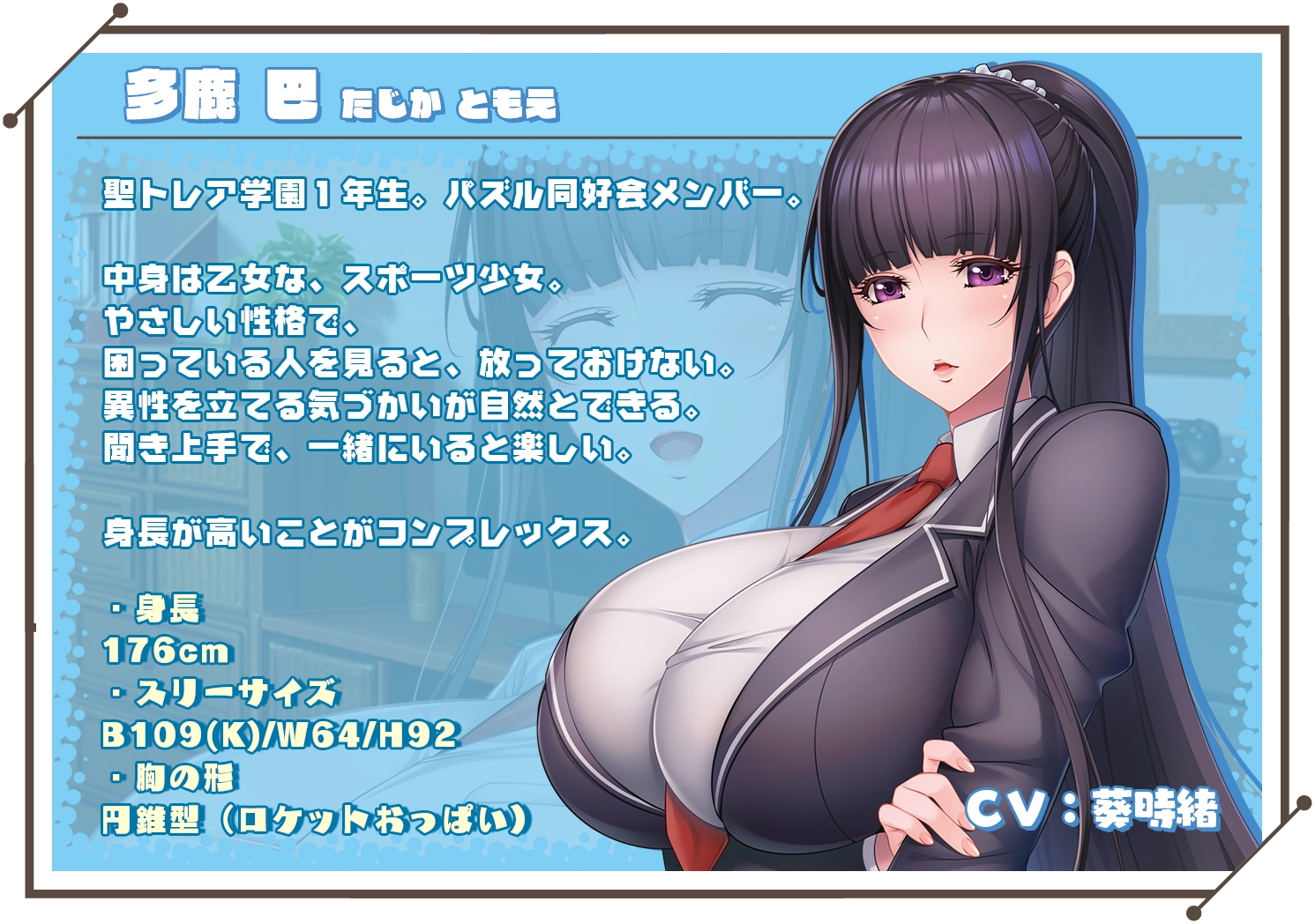 多鹿 巴(CV:葵時緒) 身高:176 聖トレア学園一年级,解谜同好会成员。 对异性自然而然渐渐感到好奇。 对自己出众的身高感到困惑。 |