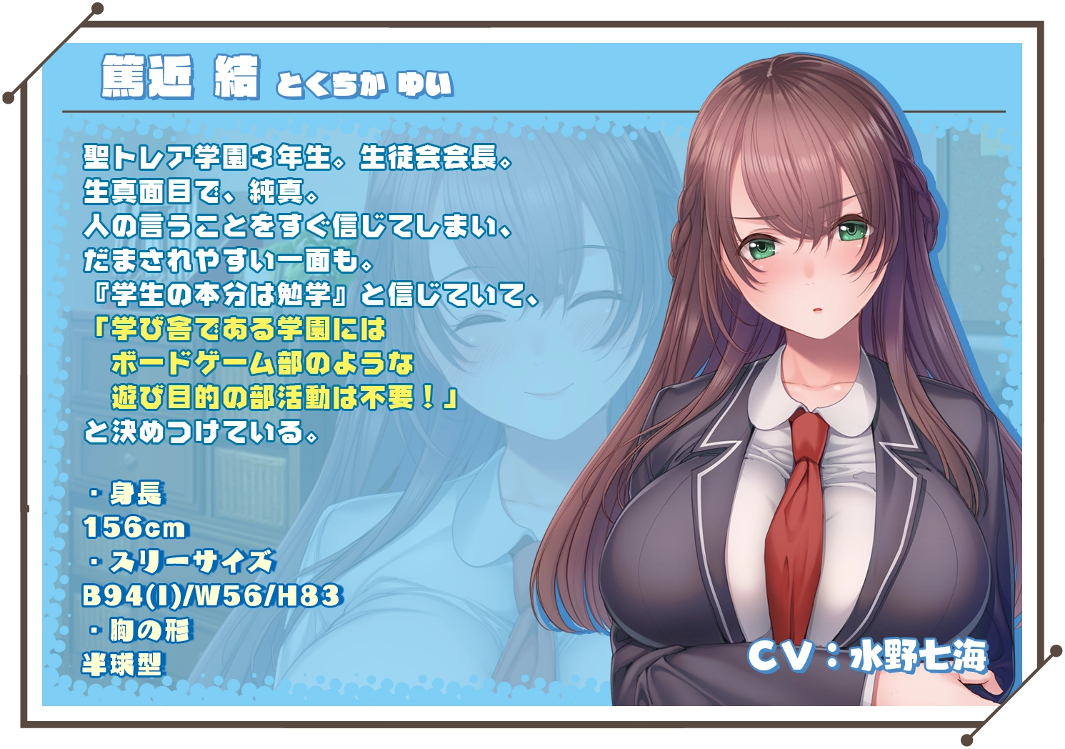 篤近 結(CV:水野七海) 身高:156 聖トレア学園三年级,学生会长。 相信“学生的本分是学习”。 |