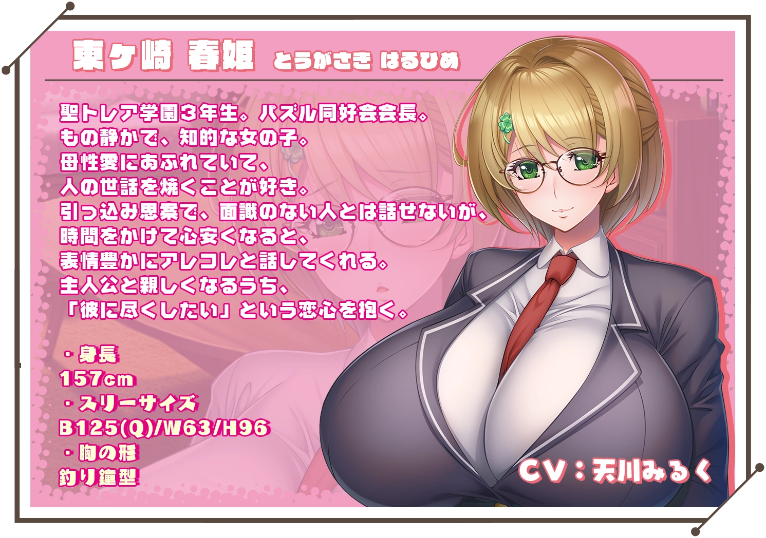 東ヶ崎 春姫(CV:天川みるく) 身高:157 聖トレア学園三年级,解谜同好会会长。 因为保守的性格,和不熟悉的人很难交谈,不过只要随时间混熟了的话,就会很热情地一起谈天说地。 |