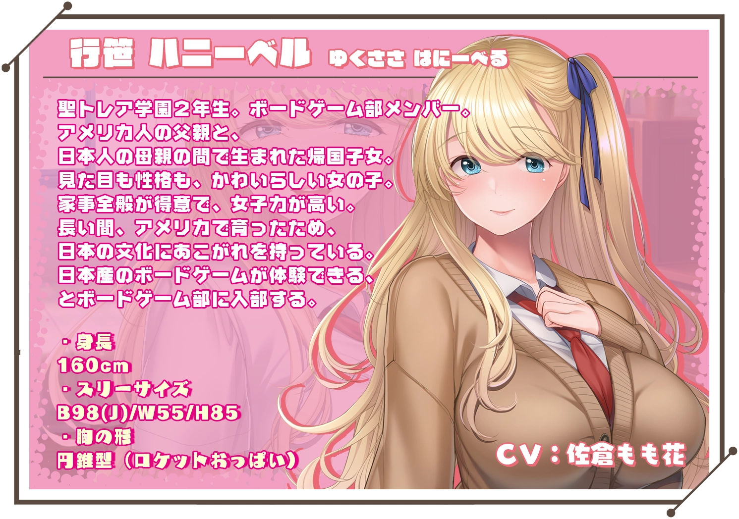行笹 ハニーベル(CV:佐倉もも花) 身高:160 聖トレア学園二年级,桌游部成员。 长时间生活在美国,对日本文化很有兴趣。 |