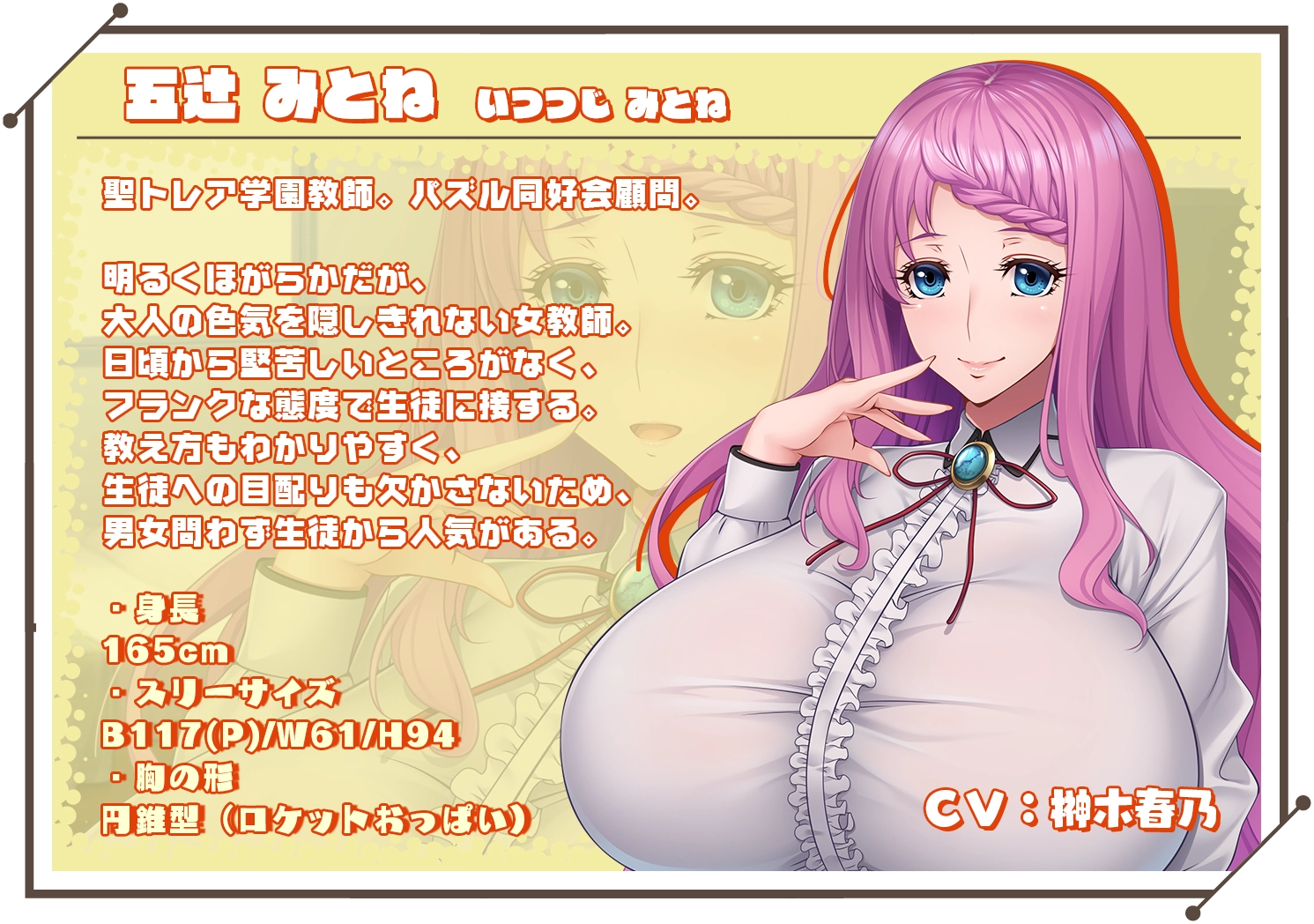 五辻 みとね(CV:榊木春乃) 身高:165 聖トレア学園教师,解谜同好会顾问。 日常没什么拘束,用坦诚的态度与学生相处,教学方式也简明易懂。 |
