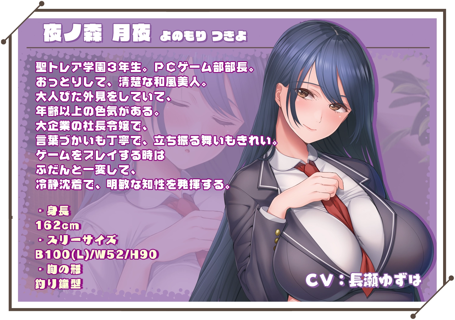 夜ノ森 月夜(CV:長瀬ゆずは) 身高:162 聖トレア学園三年级,PC游戏部部长。 是大企业社长的千金,谈吐得体举止优雅。