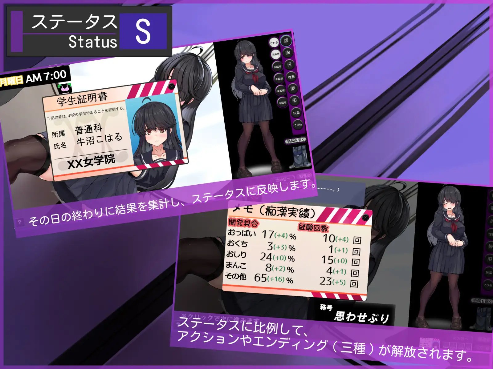 痴汉模拟策略游戏・命令选择触摸形式。好好管理警戒值、情欲值、绝顶值,将性格内向的女孩变成 “坏孩子” 吧。