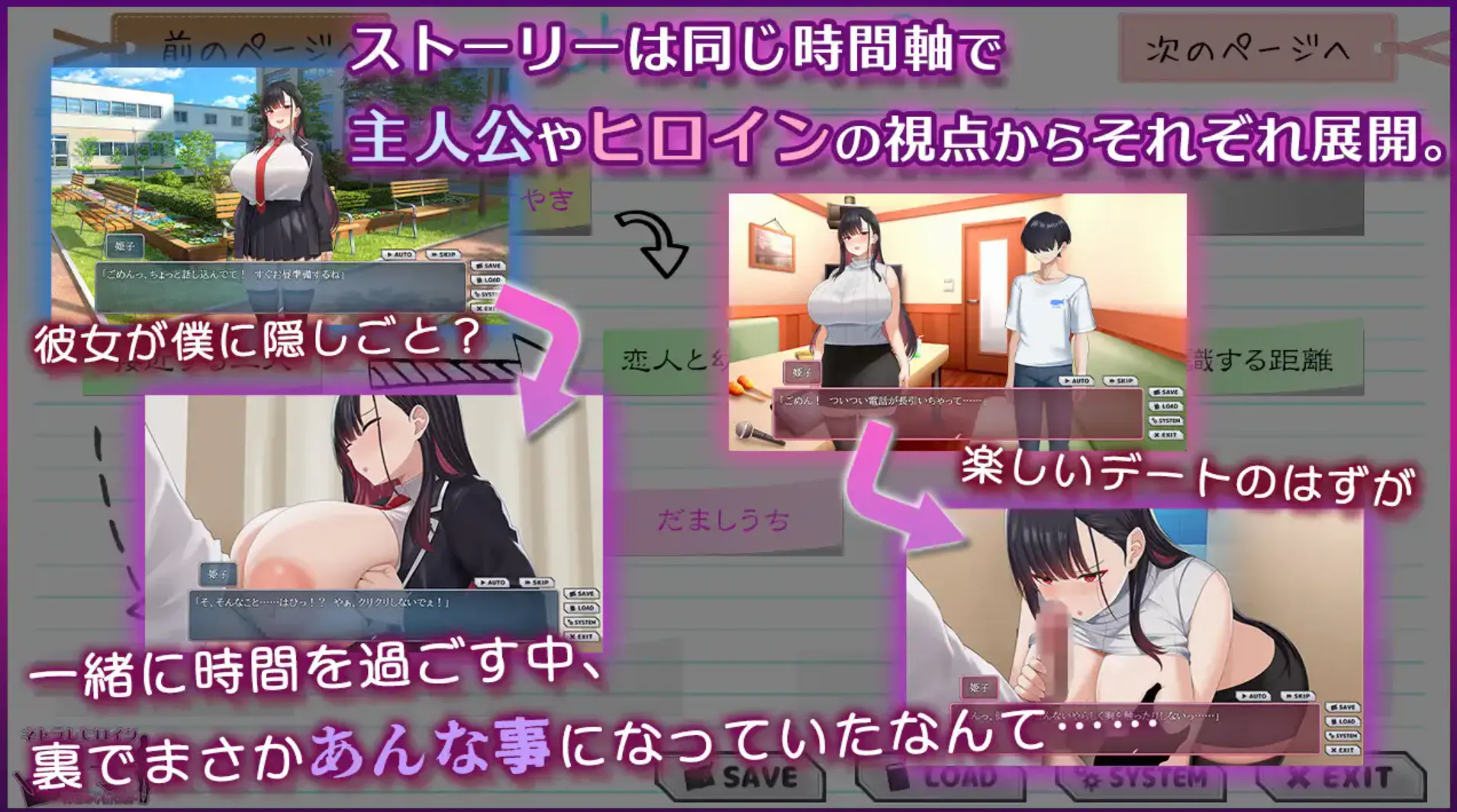 ●游戏概要与系统 本作是以主角、女主角、次要女主角、奸角各自的视角展开剧情的剧本!以主角视角为主轴,玩家可以通过各角色的视点来体验发生在背后的故事。本作非常重视被寝取的过程!请尽情享受那种作为恋人的爱意不断加深,而她在背后却…………逐渐堕落的过程。