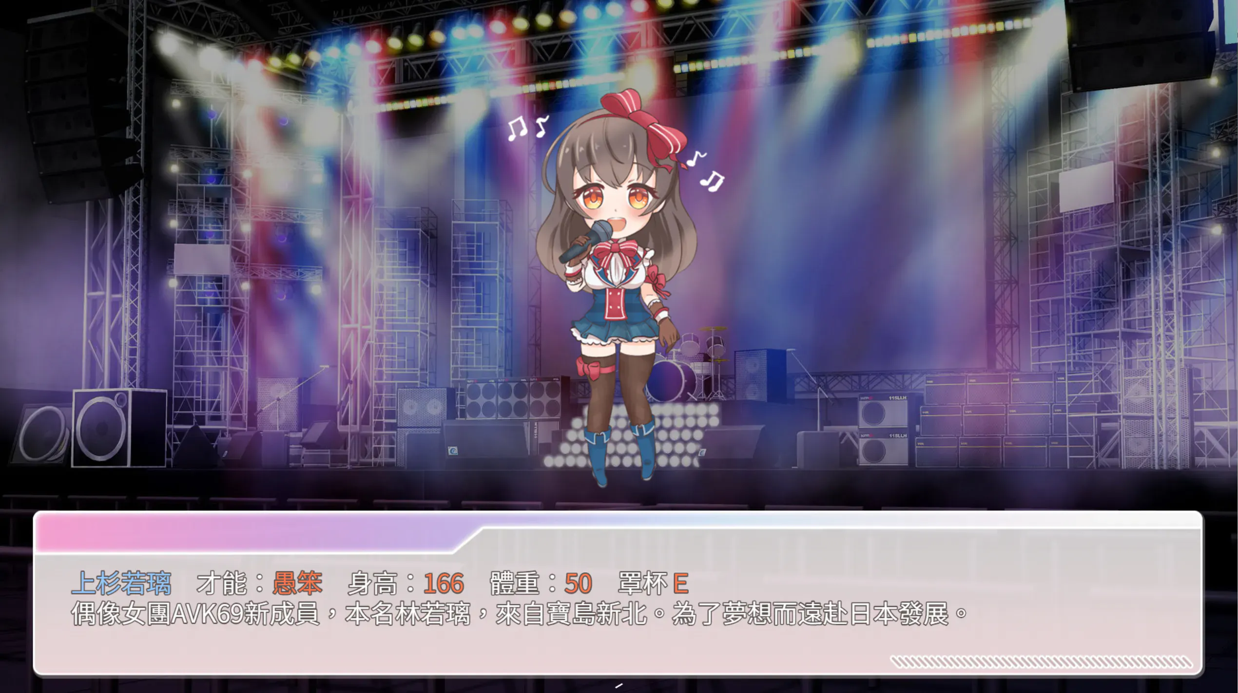 提升若璃的各项能力值,并接取更高级的通告来赚取金钱与名气吧! 除了养成玩法外,也存在类似跳舞机台的反应小游戏以调剂游戏节奏。