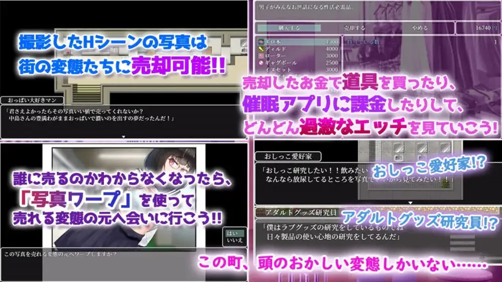 ■系统 ・在色情场景拍摄的照片可以卖给镇上的变态们赚钱! 用赚来的钱为APP充值,就能进行越来越过激的色情玩法。 ・提供阴毛显示/隐藏、眼镜佩戴/摘除功能 请按照您喜欢的状态享受色情内容。 ・完备的回忆房间 也可全解锁,想快速观看色情场景的玩家能立刻欣赏。