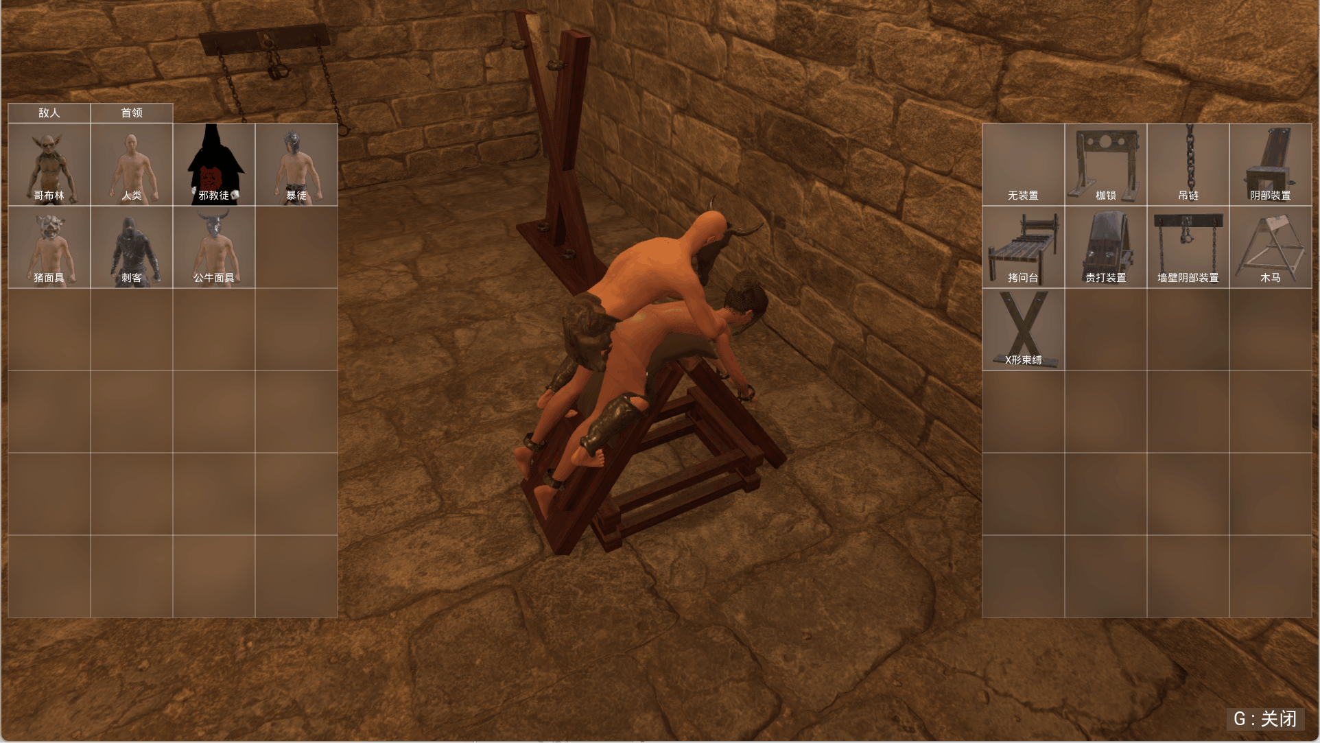 根据拘束具的种类,逃脱方法也不同,比如用开锁器开锁,或者挣扎着逃脱。 NPC 地牢的深渊里,存在着有着各种故事的 NPC 们。 从躲在角落里的奴隶○,到哥布林、拷问官、邪教信徒等,准备了丰富的 NPC 和任务。 主要 NPC 至少有一个任务,根据在前一层的行动,下一层的对话内容会发生变化。 完成任务的话,有时会给予稀有的饰品之类的报酬。 Boss 地牢的深渊里潜藏着可怕的怪物们。它们会运用各种魔法和攻击来袭击你,要打败它们绝非易事。 每个楼层都有 boss 等候,并且各自都有专用的独特动画。 饰品 / 伤痕 ○饰品○ 游戏中有各种各样的饰品。 有拘束乳头的、堵塞肛门的、封住嘴巴的等各种装饰品。 ○伤痕○ 被打屁股、被鞭子抽打,这些痕迹会残留在身体上。 持续受罚的话,伤痕会加重,但随着时间的推移会逐渐愈合。